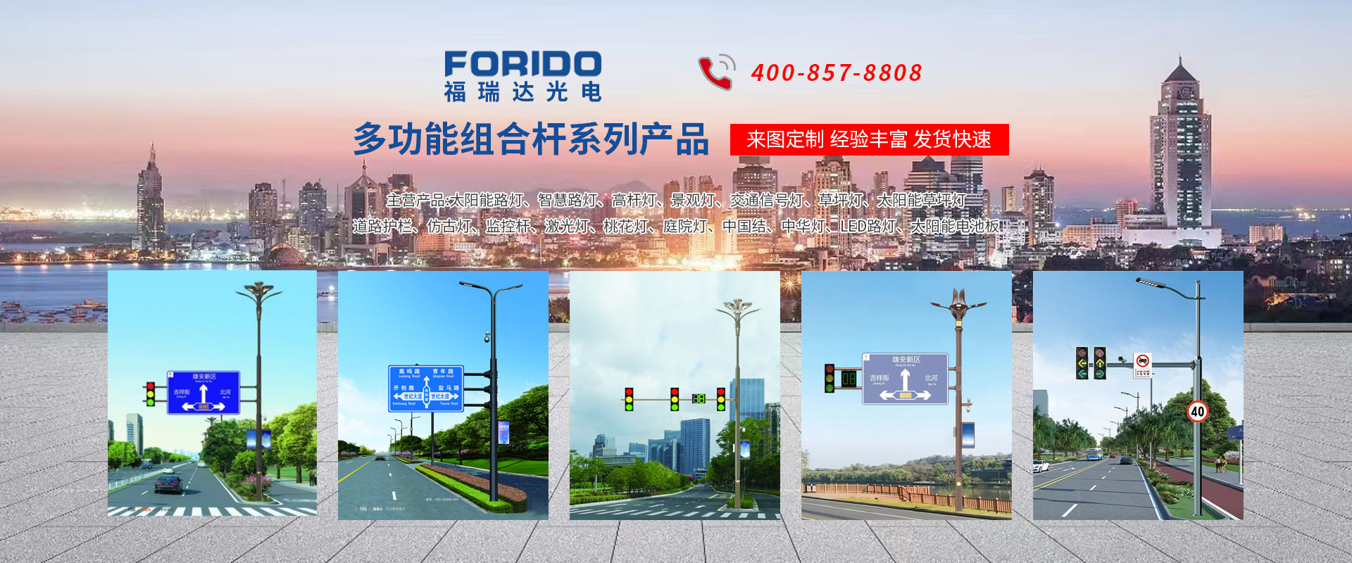 揚州福瑞達光電科技有限公司位于淮左名都歷史文化名城、中國路燈制造基地揚州市北郊菱塘工業園,公司占地面積76000平方米,注冊資金10518萬元,擁有高級技術嫻熟的員工280多人,擁有大型折彎機、激光切割、數控注塑機、壓鑄機、自動埋弧焊、氣焊、彩色粉末靜電噴塑等大型自動化設備,我公司是一家集設計、研發、生產、銷售、施工安裝服務為一體的戶外交通照明產品制造商,主要生產智慧路燈、太陽能路燈、LED路燈、高桿燈、景觀燈、交通信號燈、交通標志牌、通信鐵塔、路跨鋼結構、公交站臺、太陽能光伏組件、景點亮化、樓宇亮化工程的設計施工等。公司秉承開拓創新、銳意進取、精誠服務的企業精神,堅持以“誠信為本、技術為先、服務是金”的合作理念,我們憑借先進的制造工藝、優質的產品質量、合理的市場價格和完善的售后服務贏得了廣闊的市場和客戶的信賴。  我公司已通過ISO9001質量體系認證、ISO14001環境管理體認證,CQC產品認證,中國節能產品認證,通過“CCC”強制性產品認證,具有市政總承包,照明,交安,設計等資質···